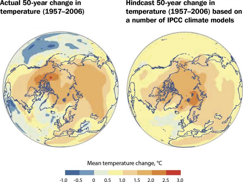 Actual and hindcast 50 year change in Arctic temperature (1957-2006)